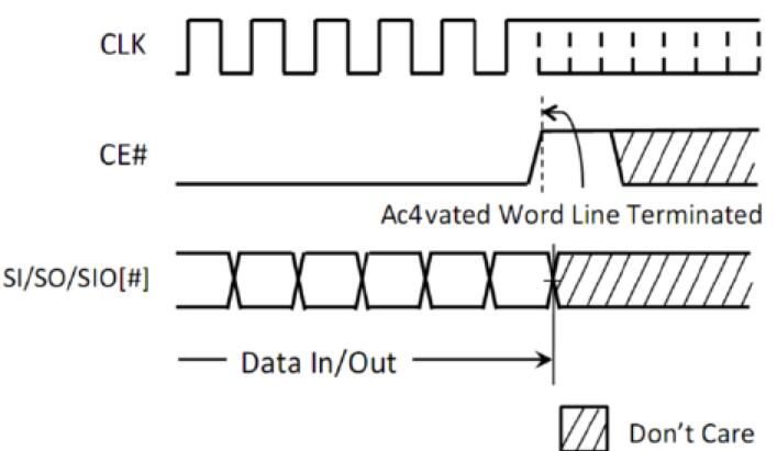 所有所有讀和寫都必須由CE#從低到高完成。CK#的上升沿是終止已激活的讀/寫字線并將設(shè)備設(shè)置為待機(jī)狀態(tài)的觸發(fā)器,否則將阻止內(nèi)部刷新操作,直到設(shè)備看到讀/寫字線已終止,無需執(zhí)行命令終止操作僅適用于讀取和寫入操作以及任何命令操作,例如Enter Quad模式命令和Reset命令。