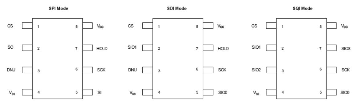 與兼容的主設(shè)備一起使用時,該設(shè)備還支持SDI(串行雙接口)和SQI(串行四接口)操作模式。要進入SDI模式,必須輸入ESDI命令(3Bh)。按照SDI操作模式的慣例,每個時鐘使用SIO0和SIO1引腳輸入兩位。位首先以MSB時鐘輸入。要進入SQI模式,必須輸入ESQI命令(38h)。對于SQI操作模式,每個時鐘輸入4位數(shù)據(jù),或者每個時鐘輸入1個半字節(jié)。半字節(jié)首先由MSB提供時鐘。