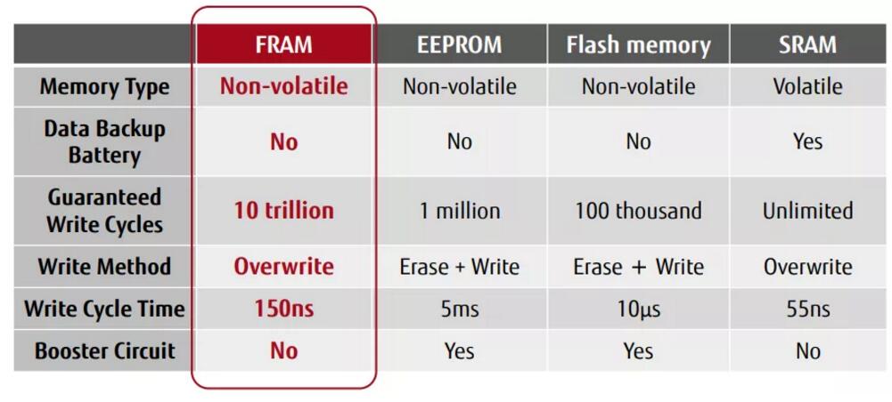 獨(dú)特性能成就技術(shù)“硬核”,F(xiàn)RAM是存儲(chǔ)界的實(shí)力派。除非易失性以外,F(xiàn)RAM還具備三大主要優(yōu)勢(shì):高讀寫(xiě)入耐久性、高速寫(xiě)入以及低功耗,這是絕大多數(shù)同類(lèi)型存儲(chǔ)器無(wú)法比擬的。