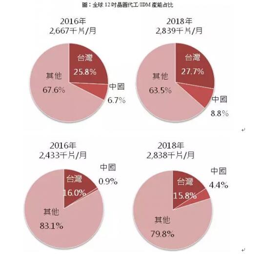 因此2018年中國企業(yè)規(guī)劃的新增產(chǎn)能目標(biāo)將可能難以實(shí)現(xiàn),預(yù)期下修到7.2萬片,其中中國廠商的先進(jìn)制程(28nm含以下)產(chǎn)能約1.2萬片,占新增產(chǎn)能近17%,預(yù)計(jì)2018年中國自主非存儲器產(chǎn)能將占全球非存儲器產(chǎn)能比重約6.7%。