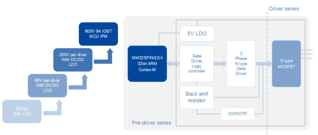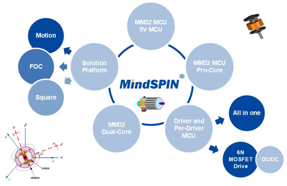 SPIN是旋轉(zhuǎn)的同義詞,再注入靈動(dòng)微電子的靈魂Mind,表示靈活與專業(yè)。包含了三大主軸:專業(yè)MCU,專用驅(qū)動(dòng)MCU微控制器及解決方案平臺(tái)。專用MCU的獨(dú)特之處是帶領(lǐng)了許多主流應(yīng)用,如:電動(dòng)車的應(yīng)用,目前市場(chǎng)的占有率仍然保持領(lǐng)先地位;專用驅(qū)動(dòng)型MCU微控制器電壓范圍從20V至600V。例:MM32SPIN222C集成了三相MOSFET、預(yù)驅(qū)以及LDO,可讓小空間發(fā)揮最大的功能,同時(shí)內(nèi)建了高性能32位的Arm Cortex-M0內(nèi)核為運(yùn)算核心,讓開發(fā)更為簡(jiǎn)單快捷;解決方案平臺(tái)由擁有超過(guò)10年以上算法開發(fā)經(jīng)驗(yàn)的MindSPIN團(tuán)隊(duì)精心打造,按技術(shù)方式分為方波、旋波FOC以及位置控制三類,按應(yīng)用方式可分為風(fēng)機(jī)、電動(dòng)工具、微電機(jī)、家電以及電動(dòng)車五大類,同時(shí)靈動(dòng)微電子還提供了不同的相對(duì)應(yīng)的特色