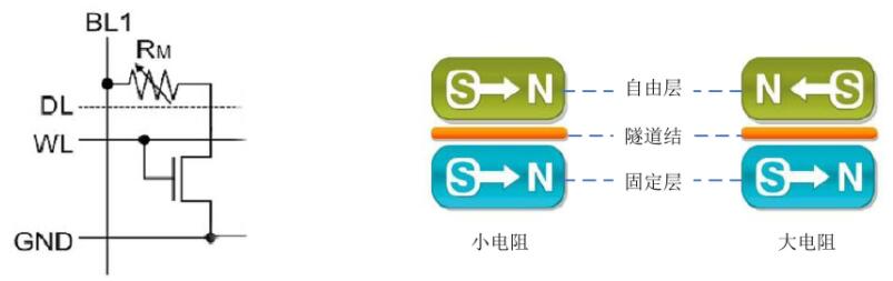 MRAM是以磁性隧道結(MTJ)儲存單元為基礎。MTJ中包含了一個維持單一極性方向的固定層,和一個通過隧道結與其隔離的自由層。當自由層被施予和固定層相同方向的極化時,MTJ的隧道結便會顯現(xiàn)出低電阻特性;反之MTJ便會有高電阻。此磁阻效應可使MRAM不需改變內存狀態(tài),便能快速讀取數(shù)據(jù)。當流經兩金屬線的電流足以切換MTJ的磁場時,在兩金屬線交點的MTJ就會被極化(寫入)。此過程能以