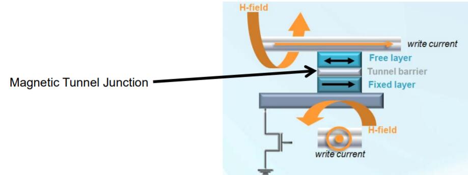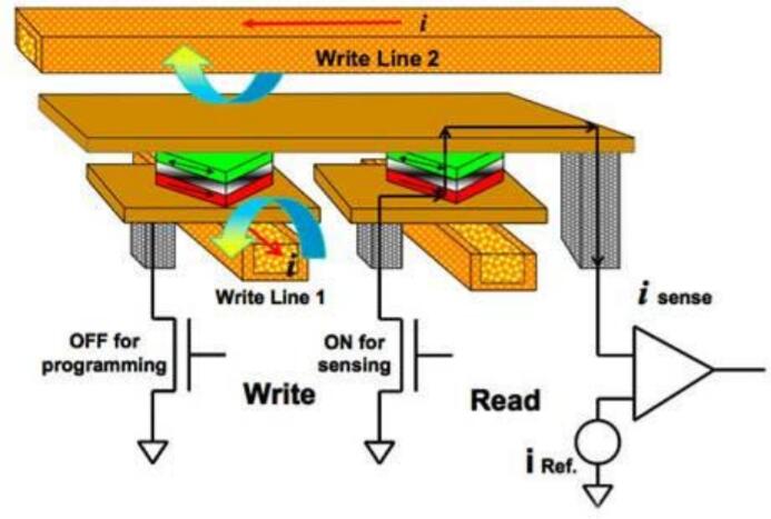 MRAM或磁性隨機(jī)存取存儲(chǔ)器使用1晶體管–1磁性隧道結(jié)(1T-1MTJ)架構(gòu),其中鐵磁材料的磁性“狀態(tài)”作為數(shù)據(jù)存儲(chǔ)元素。由于MRAM使用磁性狀態(tài)進(jìn)行存儲(chǔ)(而不是隨時(shí)間推移而“泄漏”的電荷),因此