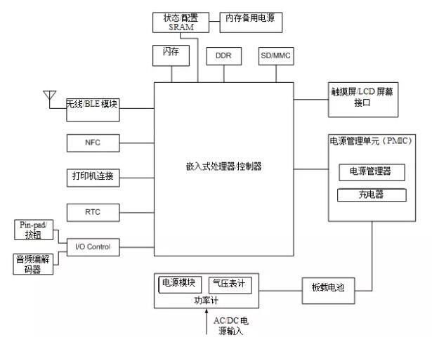 圖1. 這是現(xiàn)代POS終端的框圖。所使用的存儲(chǔ)器包括閃存、SRAM、DRAM和SD/MMC插槽。