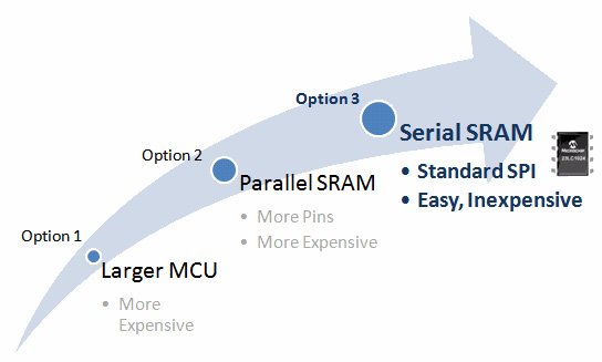 3. 串行SRAM現(xiàn)在支持向設(shè)計(jì)中靈活添加RAM,而不會(huì)帶來(lái)大型單片機(jī)或并行RAM的缺點(diǎn),它使用簡(jiǎn)單的4引腳SPI接口。 SDI和SQI接口可將數(shù)據(jù)速率提高4倍,這些器件還會(huì)通過(guò)這兩個(gè)接口來(lái)提升性能。