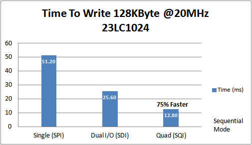 下圖給出了在SPI、SDI和SQI模式下以20 MHz向23LC1024 1 Mb SPI SRAM寫(xiě)入128 KB存儲(chǔ)內(nèi)容所需的時(shí)間。 從中可看出,SQI比標(biāo)準(zhǔn)SPI快75%。