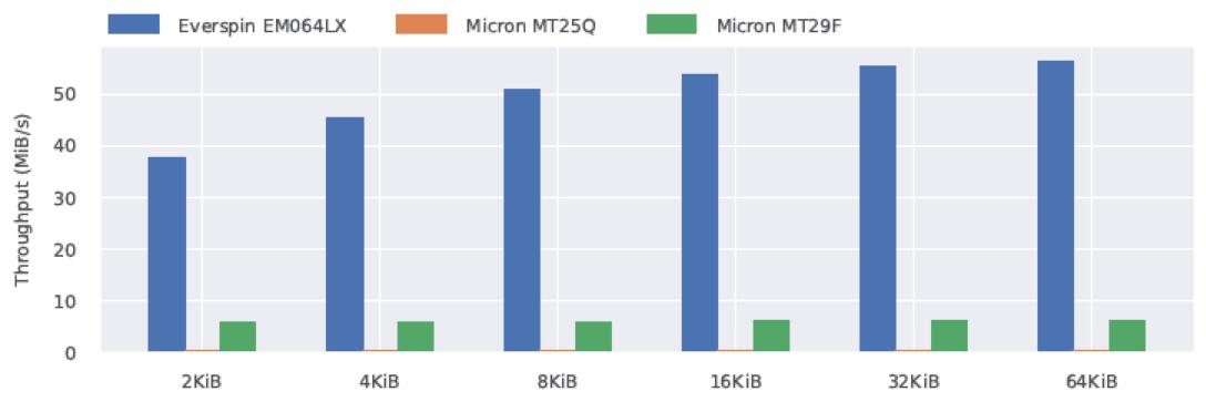 對(duì)于每個(gè)芯片,讀取/寫入64MiB的數(shù)據(jù),從地址0開始,到地址8388608(8MiB)結(jié)束。我們對(duì)各種訪問大小重復(fù)該過程:2KiB、4KiB、8KiB、16KiB、32KiB和64KiB。在閃存中,每個(gè)塊在寫入第一頁之前都會(huì)被擦除。擦除時(shí)間包括在寫入吞吐量測(cè)量中。